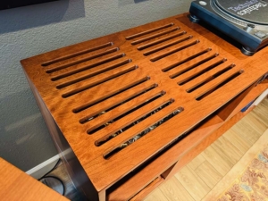 Every piece of record furniture does not leave the factory without being inspected not only for quality in construction but for smoothness to the touch as well. Every piece is sanded with very fine grit sandpaper and buffed to a fine ’micro’ finish that is silky smooth to the touch.