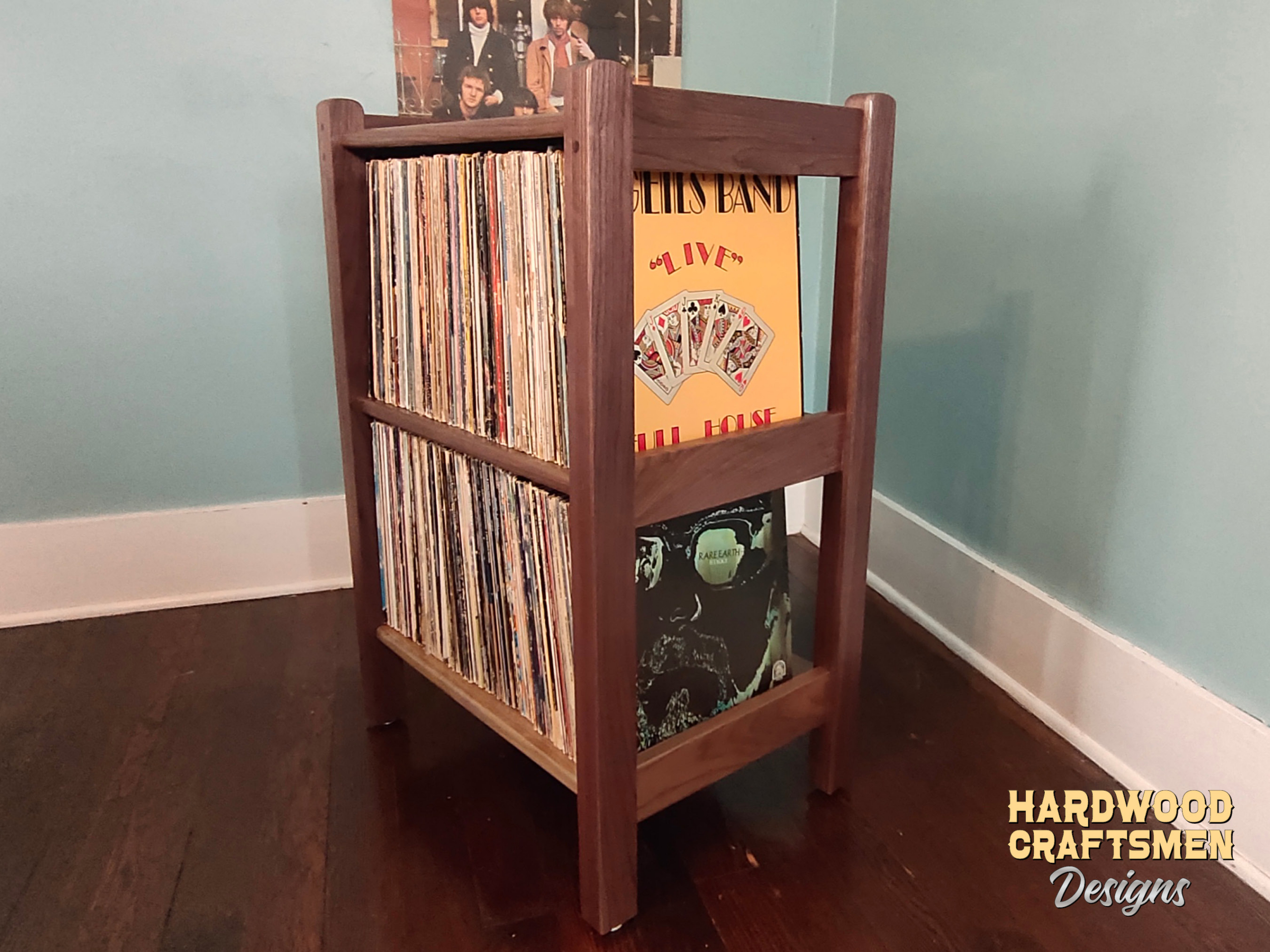 A mortise and tenon joint connects two pieces of the hardwood cabinet. Woodworkers around the world have used it for thousands of years to join pieces of wood. Mortise and tenon joints are strong and stable joints that we at Hardwood Craftsmen utilize to ensure a most stable construction for your record collection The mortise and tenon joint also gives an attractive look.