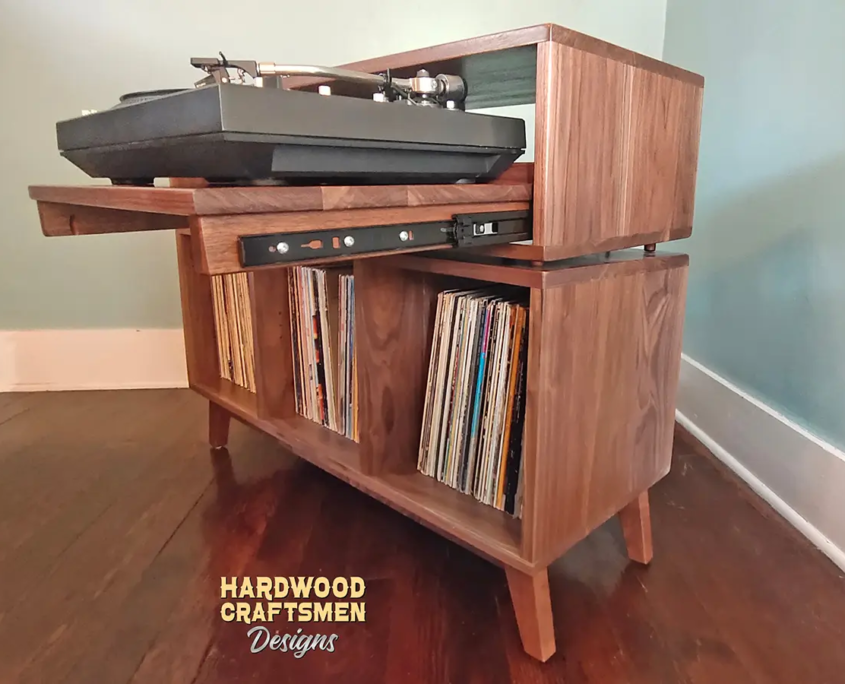 Mid-Century tall record cabinet with doors, vinyl & audio storage bays, vinyl player stand in maple – Made in the USA & Built to Last