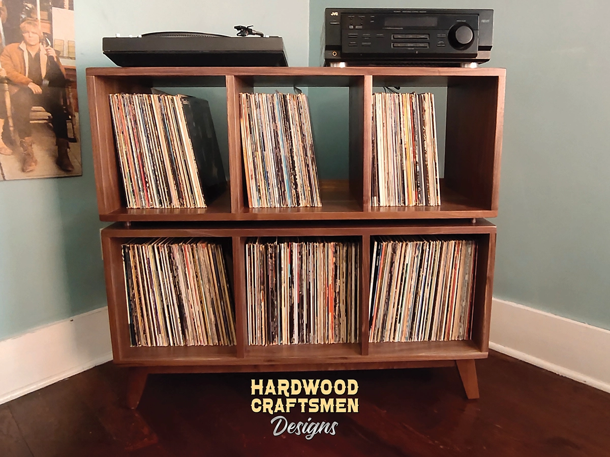 A mortise and tenon joint connects two pieces of the hardwood cabinet. Woodworkers around the world have used it for thousands of years to join pieces of wood. Mortise and tenon joints are strong and stable joints that we at Hardwood Craftsmen utilize to ensure a most stable construction for your record collection The mortise and tenon joint also gives an attractive look.