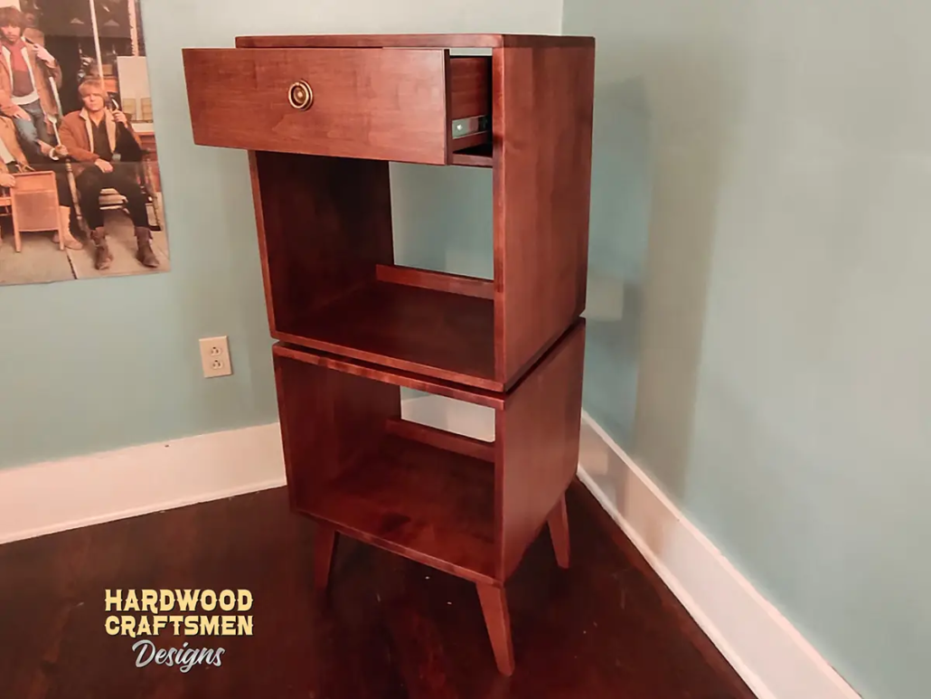 A mortise and tenon joint connects two pieces of the hardwood cabinet. Woodworkers around the world have used it for thousands of years to join pieces of wood. Mortise and tenon joints are strong and stable joints that we at Hardwood Craftsmen utilize to ensure a most stable construction for your record collection The mortise and tenon joint also gives an attractive look.